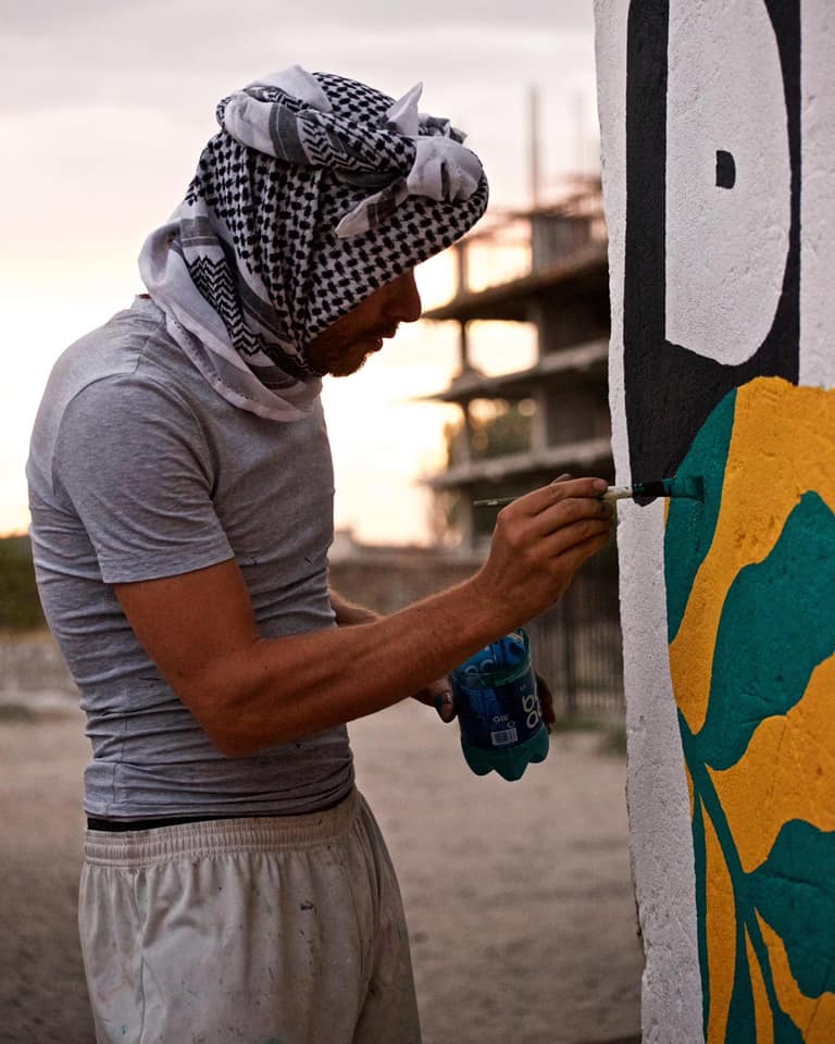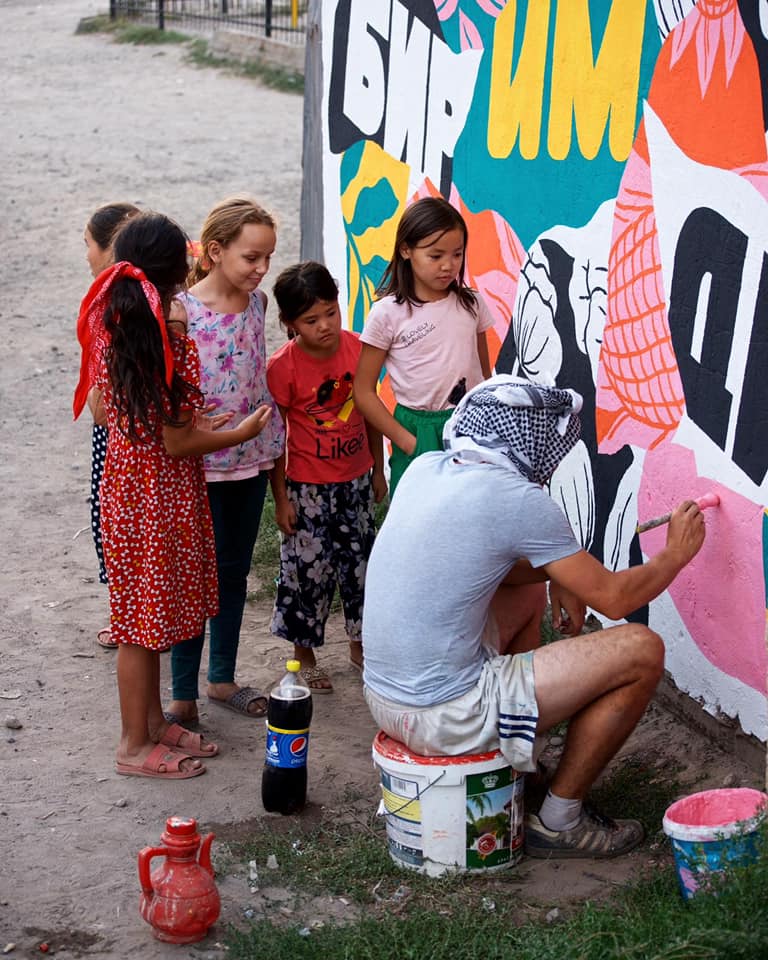 The kids are fascinated by the murals, by the language we speak, and by the way we mix colours in plastic tubs. They hang around us, watching us work, playing with stones, climbing fences and adding scabs to generously scared knees. We’ve never had a deep conversation, but we know each other. Emo is always ready to fetch water for us, Daniel can get us plastic bags or sticks to mix the paint, Albina comes over and punches our fists with excessive force because that’s how tough girls say hi.