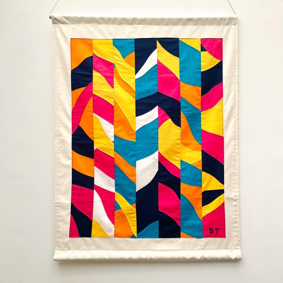 This time I created a piece without paint. Instead I used pieces of fabric sown together. I did it all myself with a sewing machine and I love how fabric adds texture! For sale, contact me for more info!