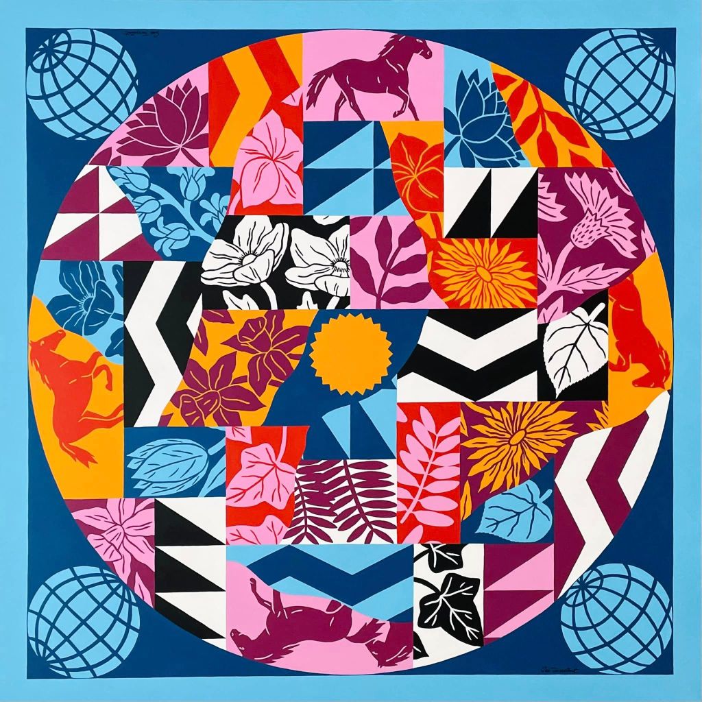 I was inspired by the garden to create a painting showing its vegetation at different times of the year. Each quarter of the disc represents one of the 4 seasons. The horses show that the piece is meant to be read clockwise. The canvas doesn’t have a top or a bottom. On the picture the top shows summer flowers because we find ourselves in the summer now. However if the painting is hung at another time of the year, the season at the top should always be the season at the moment when it is hung.