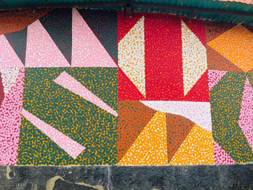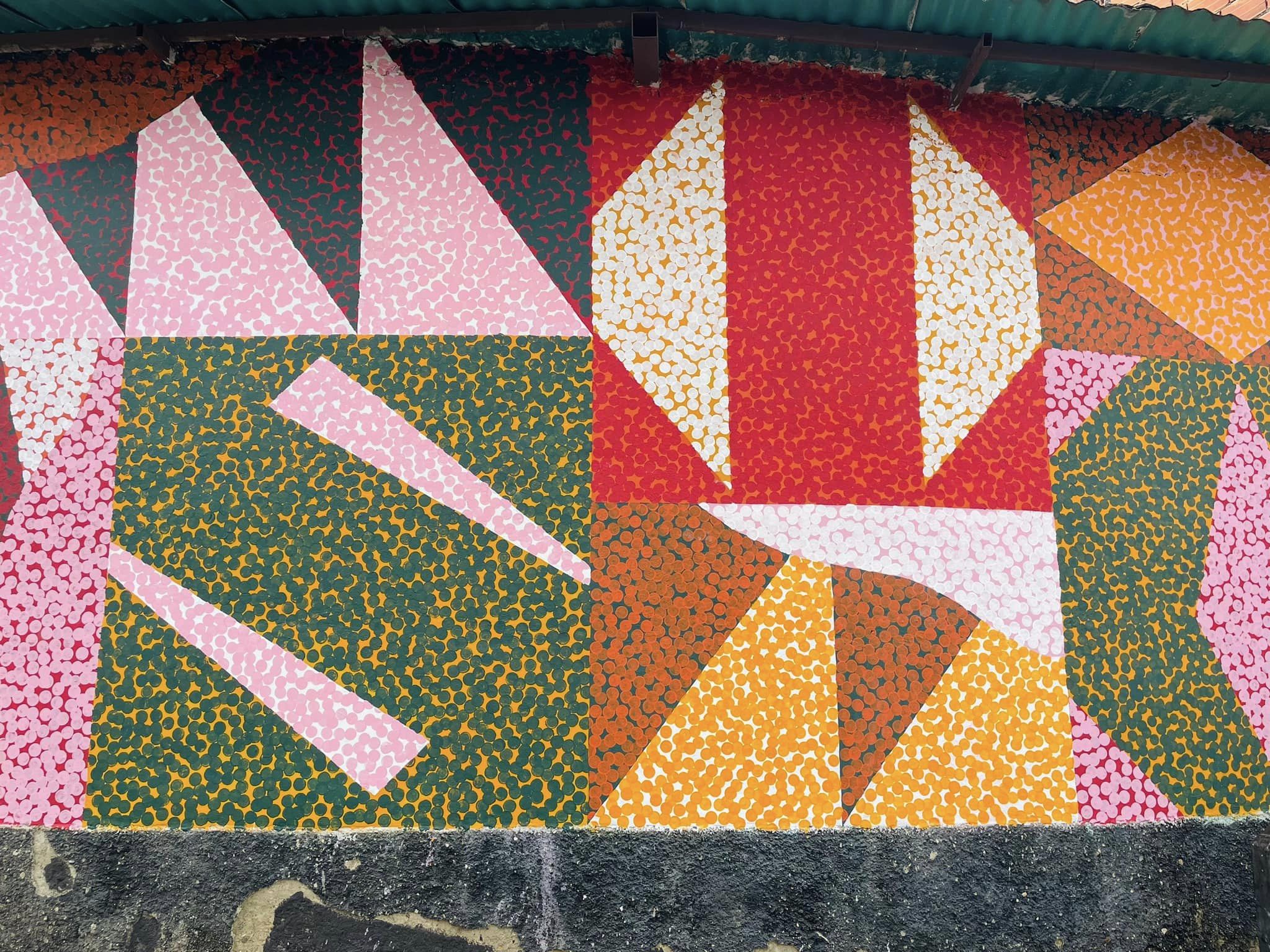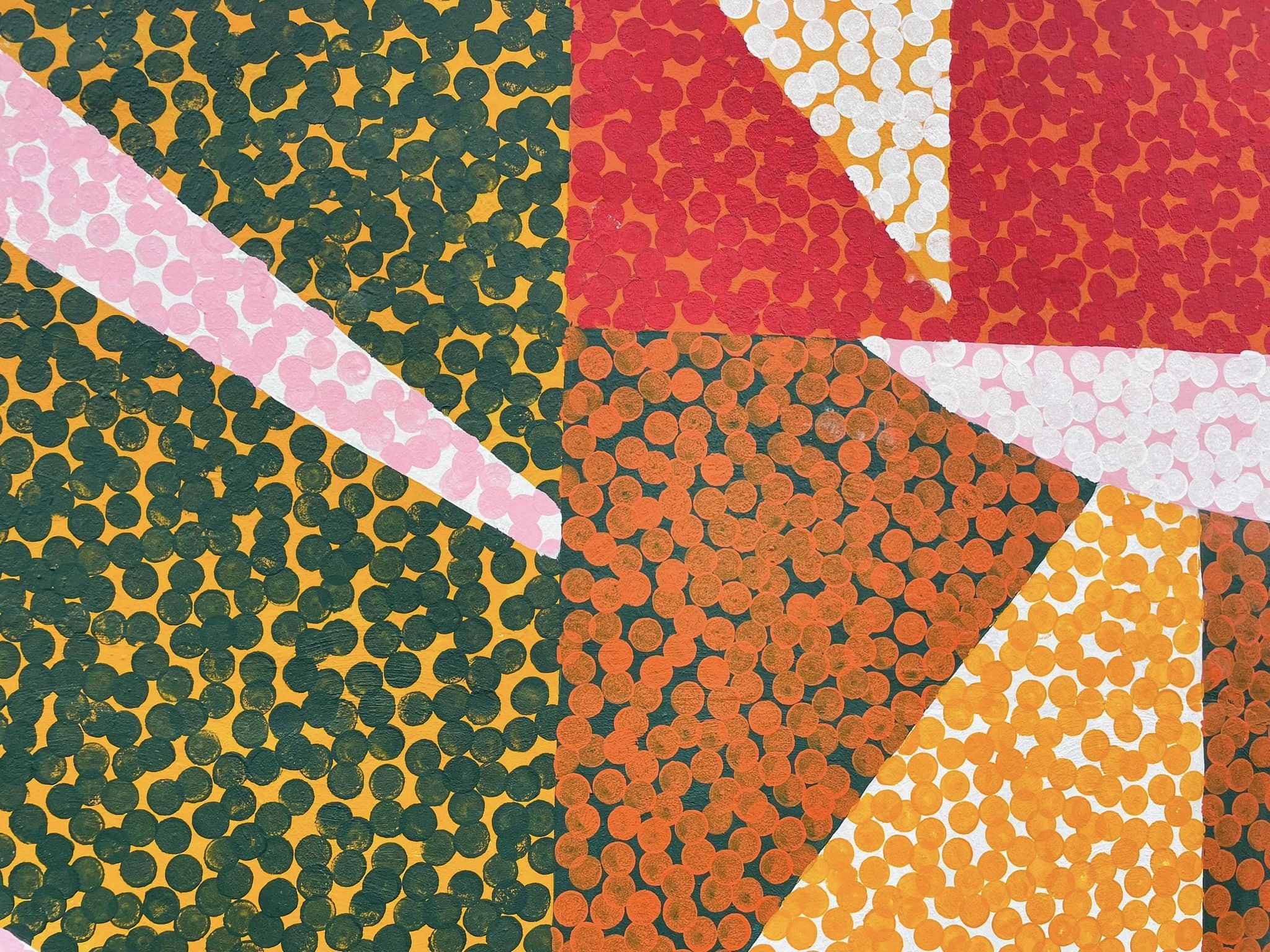 I had this idea of painting his wall with thousands of dots on coloured backgrounds. I only used 6 colours including white but the dots placed on different backgrounds create new colours and an interesting texture. Now when I close my eyes all I see is dots. I certainly put a lot of passion into this mural!