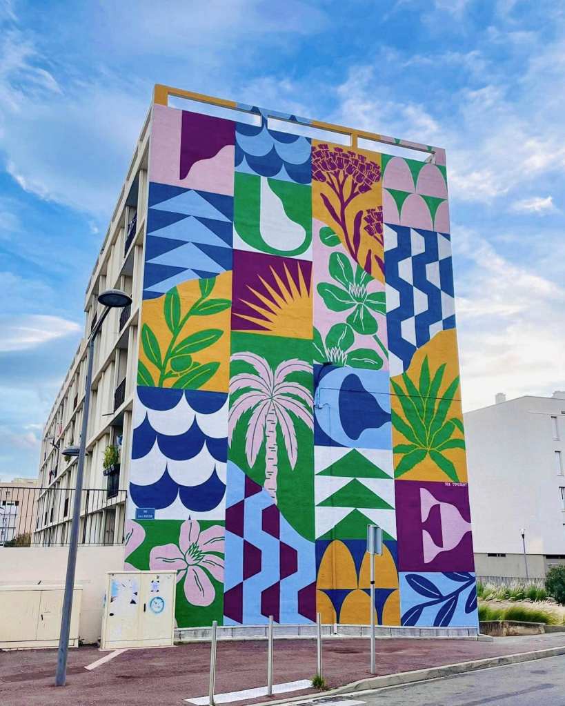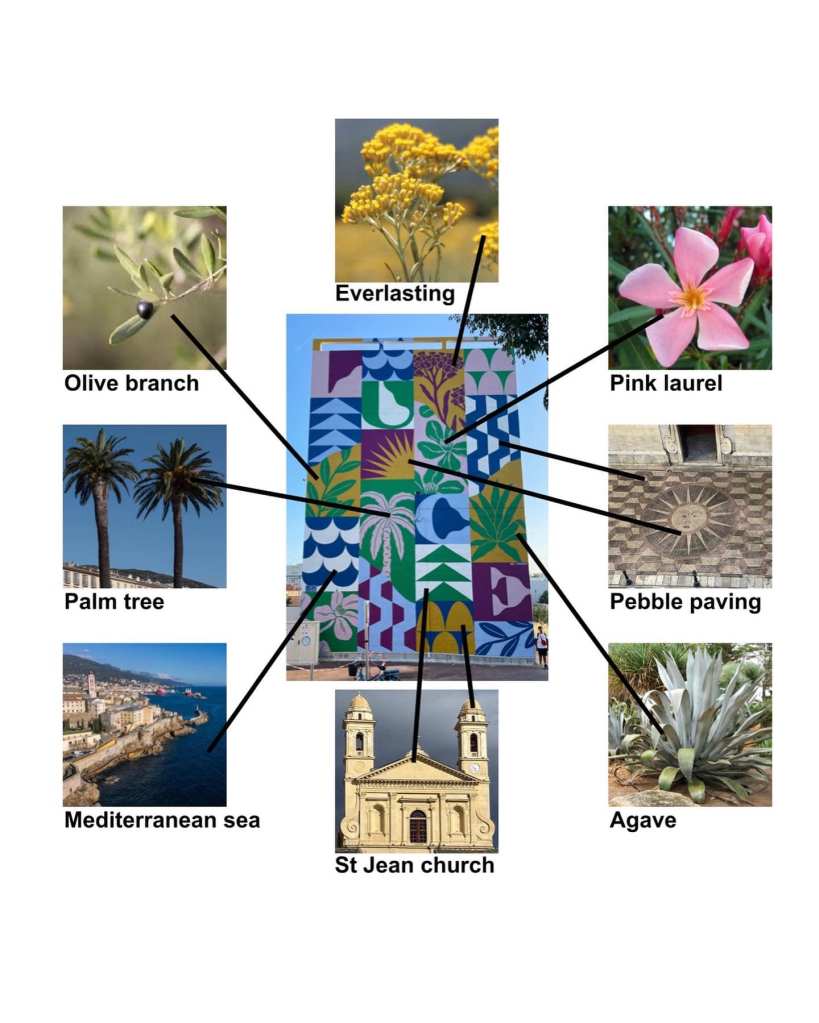 The different patterns are inspired by local churches, palm trees, pink laurel flowers, the Mediterranean sea, etc… Since I was given the word « Light », I placed a yellow sun in the centre of the mural, a symbol I took from pebble paving in Bastia’s high street.