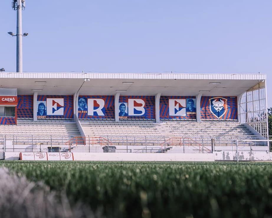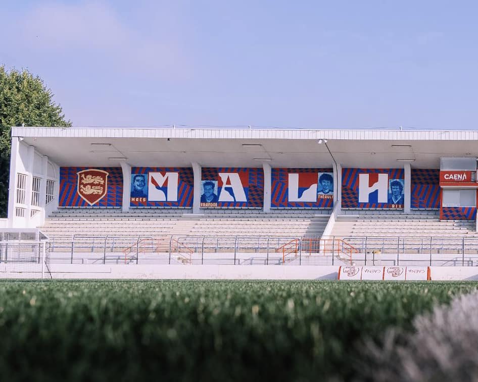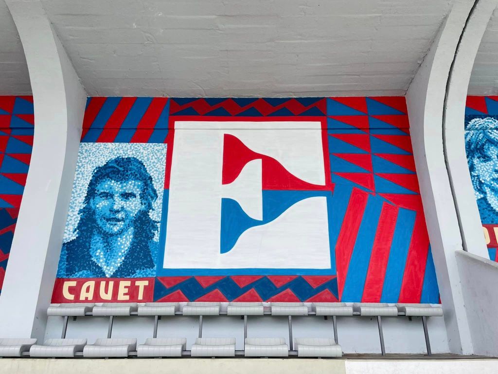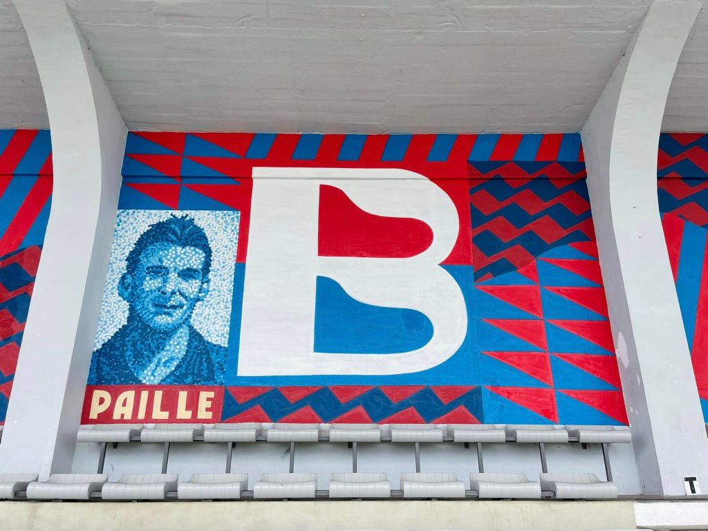 I painted the portraits of 8 club legends who’ve played here : Maës, Brandao, Théault, Rix, Cauet, Olsen, Paille and Gravelaine. My idea is to share some history, and give something to look at for the fans inside the main stand. But I also wanted the mural to be highly visible from afar with huge white letters spelling out “MALHERBE” – the name of the club.