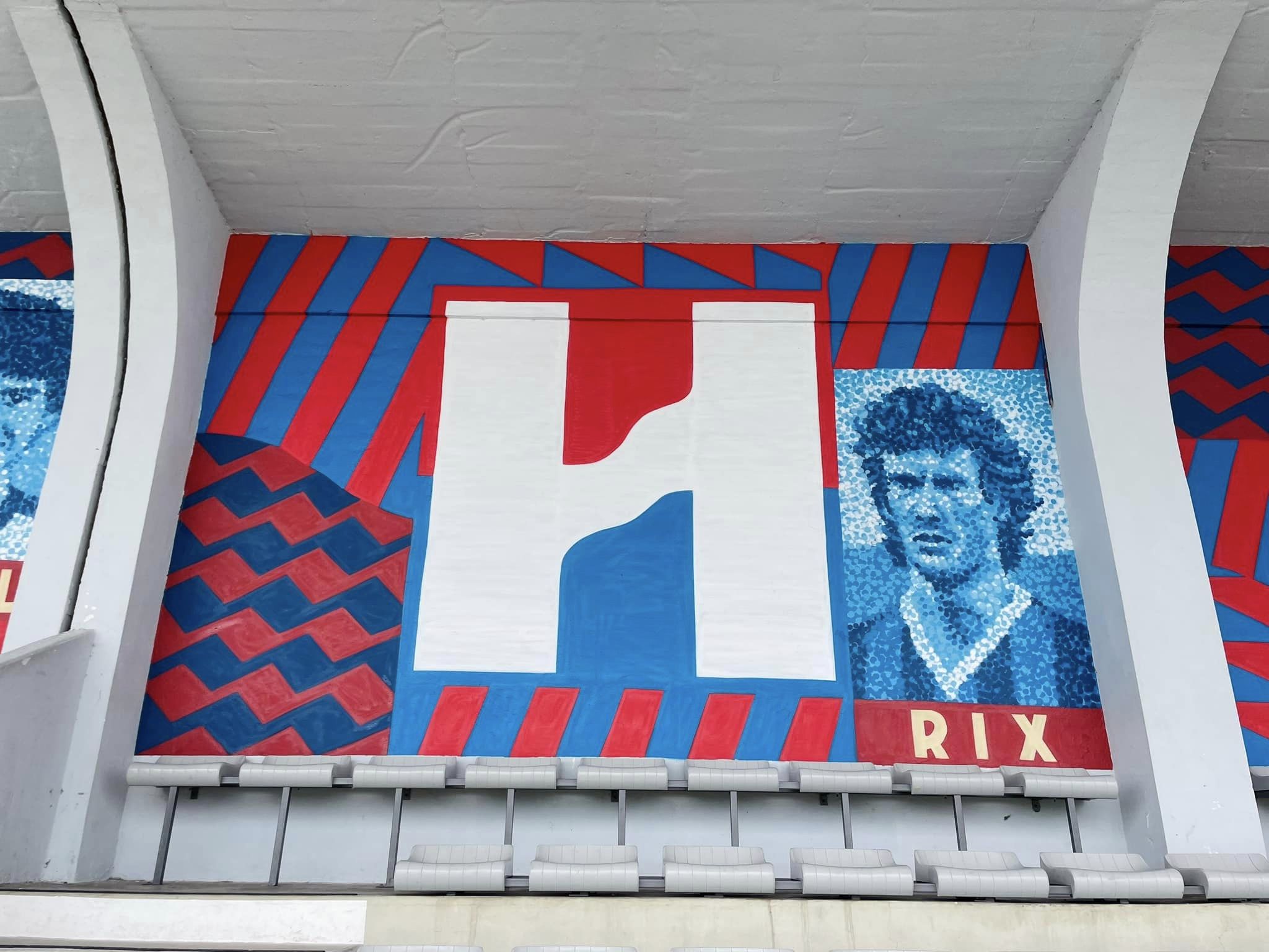 I painted the portraits of 8 club legends who’ve played here : Maës, Brandao, Théault, Rix, Cauet, Olsen, Paille and Gravelaine. My idea is to share some history, and give something to look at for the fans inside the main stand. But I also wanted the mural to be highly visible from afar with huge white letters spelling out “MALHERBE” – the name of the club.